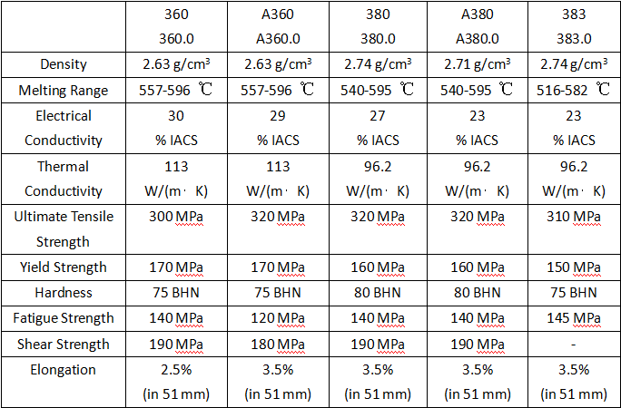When it comes to the selection of the best aluminum alloy for die casting, other die casting aluminum alloys including AA C443.0, AA A413.0, AA B390.0, AA 518.0, and more. The most popular alloy for aluminum die casting is A380, you can use A383 when producing intricate die casting components that requiring specific die-filling performance, but the castings made from A383 is not as durable as A380. A360 is more difficult to cast than A380, you can check its properties below when considering using it.