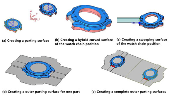 Using the surface curve design function of CimatronE software, make a curve based on the centerline of the convex part to break the surface of the watch case, and cut the model into two halves, one in the concave mold and another in the convex mold. Then use the parting function to quickly disconnect from the disconnected curved surface to form two curved surfaces, cavity and core parting, as shown in the above image. The next picture shows the process of creating a parting surface. Design a curved parting line based on the curve in the above image, and design this curved parting line into a parting surface to form a curved parting, avoiding the use of a lateral core pulling mechanism. The position of the watch chain has both beveled and curved surfaces, which can be done by complementing the curved surface step by step. Use the closed island function to create the center hole as an internal parting surface. Create a hybrid curved surface along the contour of the parting surface at the position of the watch chain, then create a combined curve with the outer contour of the curved surface. And create a sweeping surface with this curve. The other sweeping surface can be obtained by mirror images, see the following picture. Create a combined curve from the outer contour of the sweeping surface and other contours of the shell, and use this curve to create a sweeping surface. Mirror the created cavity shell parting surface to another cavity, and then use the ZX plane to cut the outer parting surface to complete the design of parting surface parts. These surfaces are grouped in the parting surface parts for the design of subsequent mold forming parts.