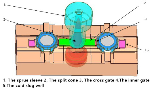 In the formula, d3 is the diameter of the split cone at the bottom of the sprue, mm; L is the length, and is from 50 to 70mm. Take 60mm as the length, and d1 is the diameter of the entrance. d3 is 18mm calculated by the formula (4) and the large end diameter of the sprue sleeve is d2=d3+2h=18+2X2.5=23mm. The cross-section of cross gates with a single cavity is rectangular, and the size is 15mm×5mm. The cross-sectional area of single cavity F is 0.75cm2, and the cross-sectional area of two cavities F is 1.50cm2. The calculated cross-sectional area of the single cavity inner gate F is 0.31cm2, and the cross-sectional area of the two cavities F is within 0.62cm2. The actual cross-sectional ratio after optimization is calculated to be 1.61:1.50:0.62=2.60:2.42:1. The designed gating system is shown below.