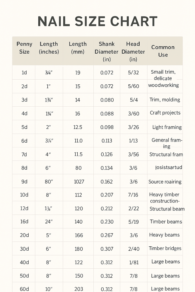| Nail Type | Penny Size (d) | Length (inches) | Gauge (diameter) | Typical Use |