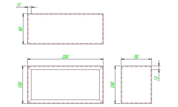 As shown in the figure, this box has a length of 200, a width of 100, a height of 80, and a folded edge of 10. Therefore, bending requires 8 cuts, which is 4 cuts each from 10 to 80. Let’s first make a copy of the main view: