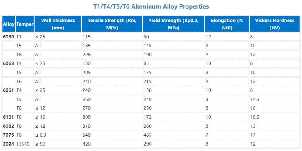 To provide a more detailed comparison of the mechanical properties of different aluminum alloys and tempers, the table below outlines the yield strength, tensile strength, elongation, and hardness for various aluminum profiles in the T4, T5, and T6 tempers.