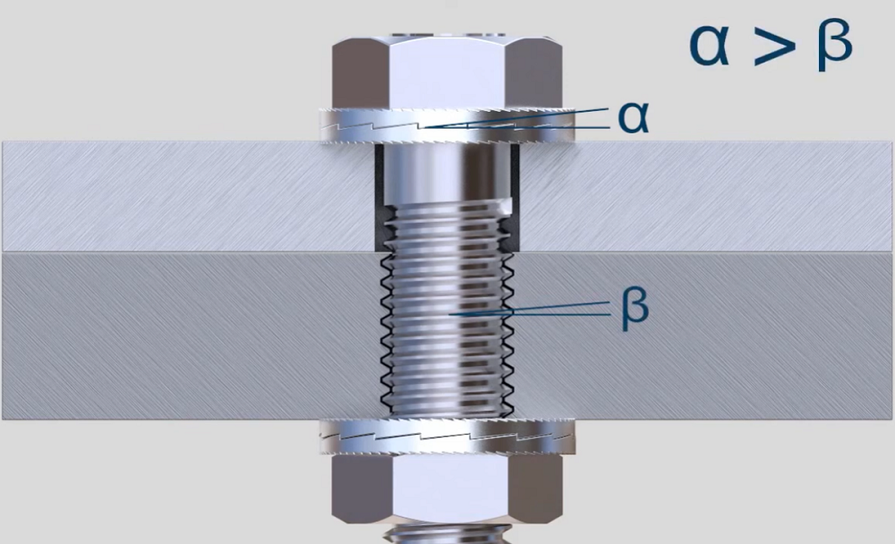 The wedge lock washer operates on a geometric principle. The cam angle (a) of the washers is engineered to be greater than the thread pitch angle (ß) of the bolt. When the joint is subjected to vibration or dynamic loads, any tendency for the bolt or nut to rotate is counteracted by the wedge effect created between the cam surfaces. As loosening is attempted, the cams move up against each other, increasing the clamping force instead of reducing it. This prevents the fastener from coming loose unintentionally, maintaining the preload even in severe vibration or load conditions.