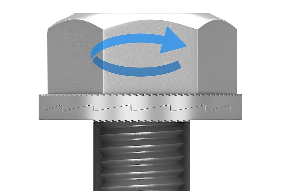 When untightening, the top washer’s cam rides over the bottom washer’s cam, which stretches the bolt further before it can be loosened. This mechanism leaves clear impression marks from the washer serrations on the mating material, indicating the security provided by the wedge-locking action.