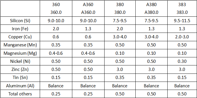 When it comes to the selection of the best aluminum alloy for die casting, other die casting aluminum alloys including AA C443.0, AA A413.0, AA B390.0, AA 518.0, and more. The most popular alloy for aluminum die casting is A380, you can use A383 when producing intricate die casting components that requiring specific die-filling performance, but the castings made from A383 is not as durable as A380. A360 is more difficult to cast than A380, you can check its properties below when considering using it.