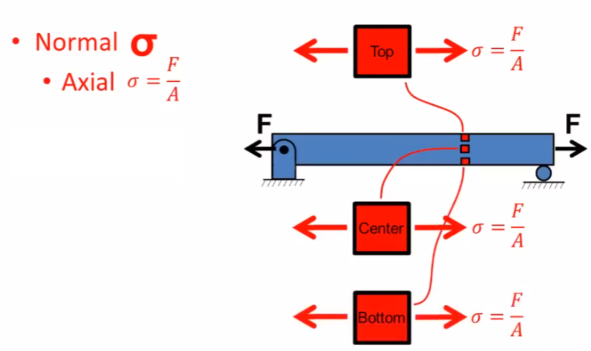 - Normal stress: force normal (perpendicular) to the cross-section.