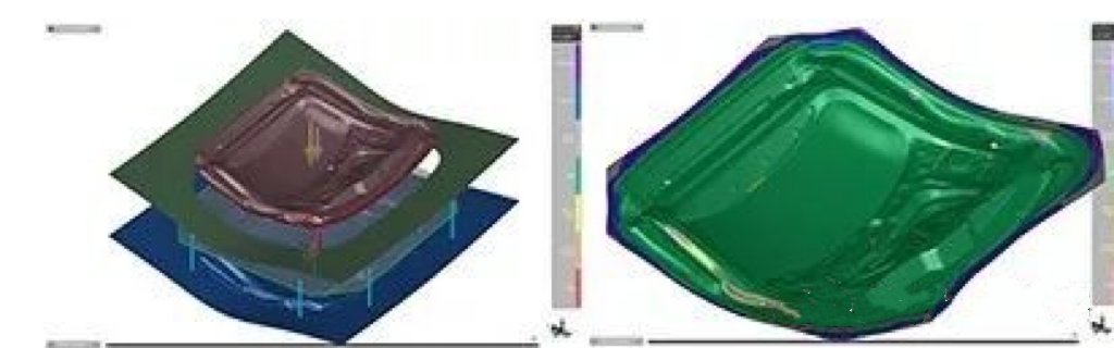 Depending on the shape of the part, due to the large curvature in both directions, an upward convex single-action deep drawing scheme is usually used, which is conducive to the inflow of material and the forming of the part. However, there are deep holes in the lower part of the tailgate and on the left and right sides. The reverse drawing, and the draft angle is small, and there is a risk of cracking.