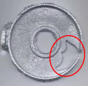 Hot tears are the formation of irreversible failure or a crack in the still semi solid casting. This occurs in the solidification phase of the casting process. In the below image we can see a hot tear defect, the cracks are clearly obvious. Best way to check castings for hot tears is to check them by eye as most of these defects will be visible. However in some cases it may be necessary to respect through magnification or even X-ray. This defect will result in the castings being scrapped as the casting has a weak point and will not have full integrity.