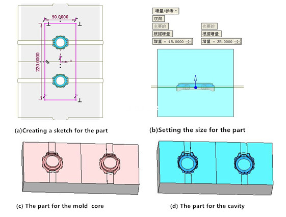 Select the moving plate system to create a document named core. Use the sketching tool to create a sketch on the XY plane. Set the stretch positive increment to 45mm and reverse increment to 35mm, and the mold core design is completed by the parameterized removal function of the software. The cavity design can be completed in the same way as the fixed plate system.