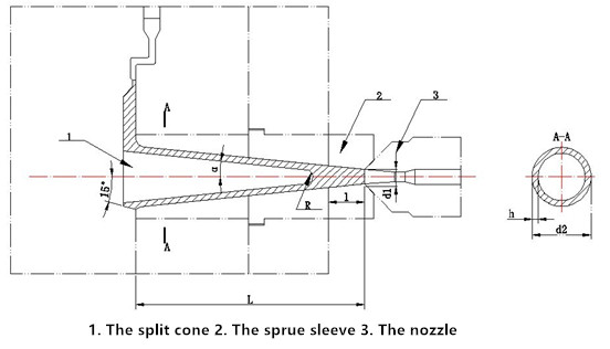 The sprue used in the hot chamber die casting machine, which is mainly composed of a sprue sleeve and a split cone. The size of the sprue sleeve should be determined according to the structure of the casting during the design of the sprue sleeve. The diameter of the entrance of the sprue sleeve is set to be 8mm based on the die casting quality manual. In order to smoothly bring the molten zinc alloy to the cavity, increase the holding force of the molten alloy to the split cone, which is easier to keep the remaining material of sprue in the movable mold when the mold is opened. The unilateral demolding slope of the split cone is designed. The length L is from 50 to 70mm. The distance between the end face and the top of the split cone is l being 10 to 12mm, R being 4 to 5mm and h being 2.5 to 3.5mm. According to the right triangle theorem, the bottom diameter of the split cone can be obtained by the following formula: