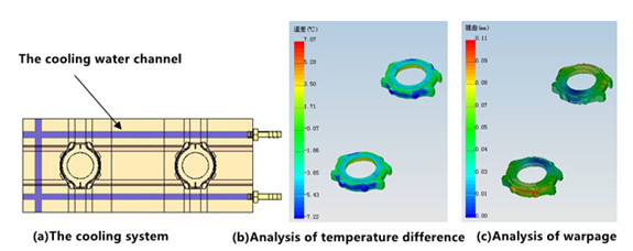 The working temperature of the alloy is from 150 to 200?. In order to ensure the cooling effect, a water channel with a diameter of 6mm is used, and the distance between the hole wall and the cavity wall is 15mm. According to the structural characteristics of the die casting and the characteristics of the zinc alloy material, the cooling system is designed as shown below. Through analysis, the temperature difference is controlled at 3?. The maximum warpage is 0.11mm, which is located at the left and right convex parts and can meet the needs of customers.