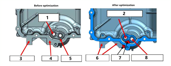 Because machining removes the dense layer on the outermost surface of the aluminum alloy die casting, internal defects are exposed on the inner surface of the oil hole and threaded hole after the dense layer being removed for the machining allowance. And the shrinkage cavity between the holes forms a leak. The method is to increase the diameter of the casting hole, change the oil hole to a non machining hole, reduce the machining allowance for the bottom hole of the screw hole and minimize the damage to the dense layer of the casting hole surface by the machining. At the same time, the processing area is reduced for the cylinder body and the sealing surface, avoiding the risk of exposing gas porosity on the processing surface, as shown in Figure 3.