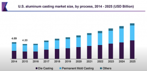 The global aluminum casting market size was estimated at 47 point 1 billion in US dollars in 2018. It is anticipated to witness a compound average growth rate of a nine point one percent from 2019 to 2025. Upswing in the use of aluminum in automobile manufacturing and heightened demand from the building and construction sector in Asia Pacific has boosted the growth of the markets. Here’s one more chart showing the U.S. aluminum casting growth from 2014 right up to 2025 as a forecast.